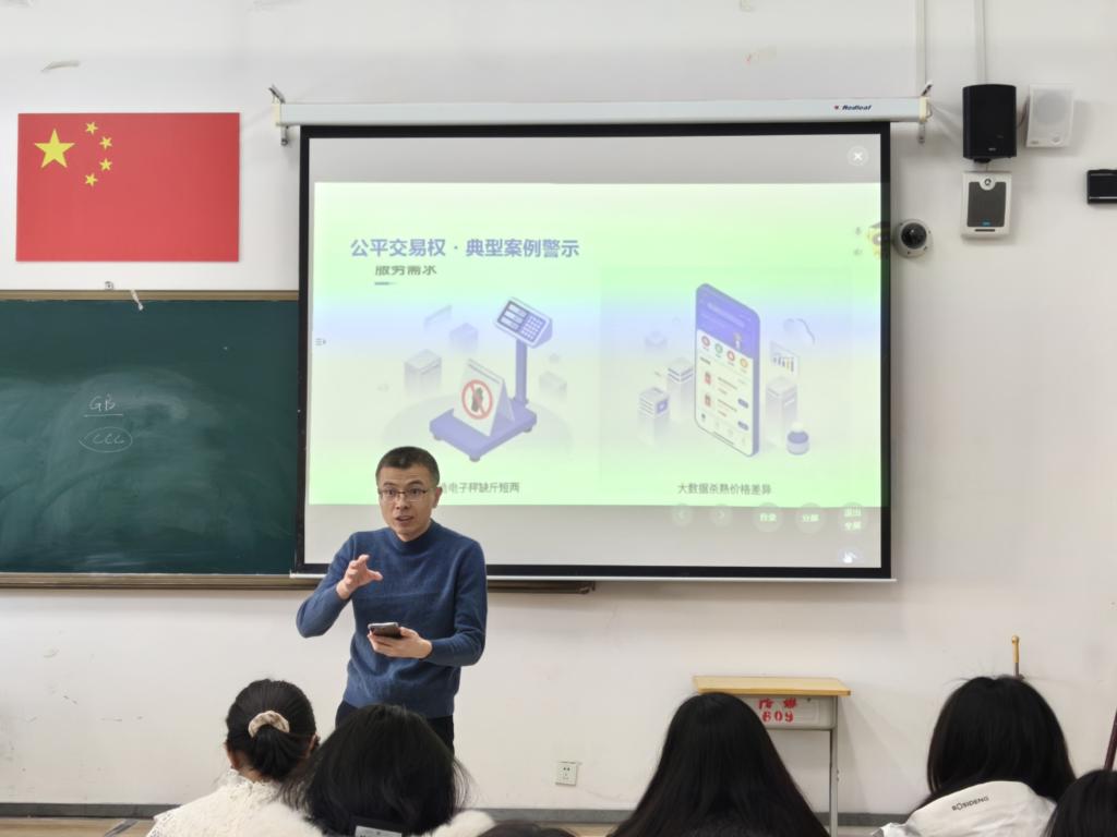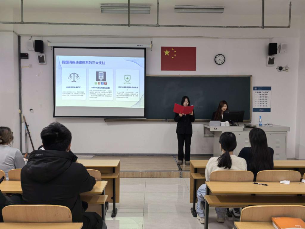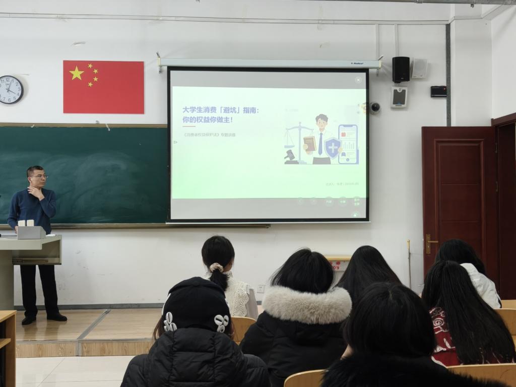 紧接着,同一时间的崇文楼A208教室中,法学社特邀张星教授主讲“你的权益你做主”专题讲座。教授深刻剖析消费者被侵权前的心理状态,以实用的策略与方法为同学们指点迷津。同学们在聆听中受益匪浅,维权观念如春雨般润物无声,深植于心。